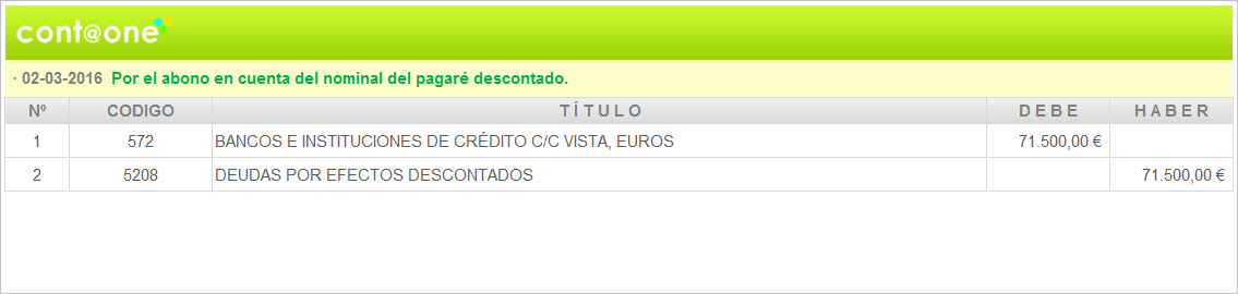 «La Industrial, S.A.» descuenta el 02-03-2016 el pagaré en las condiciones siguientes:
